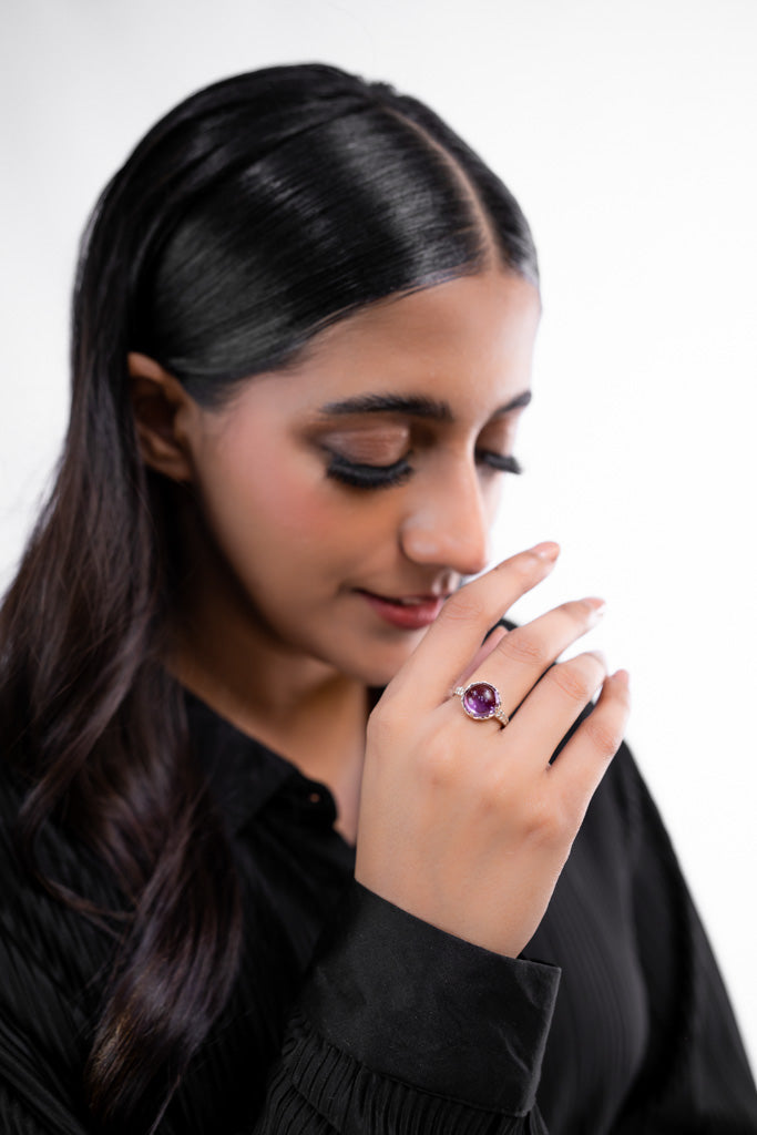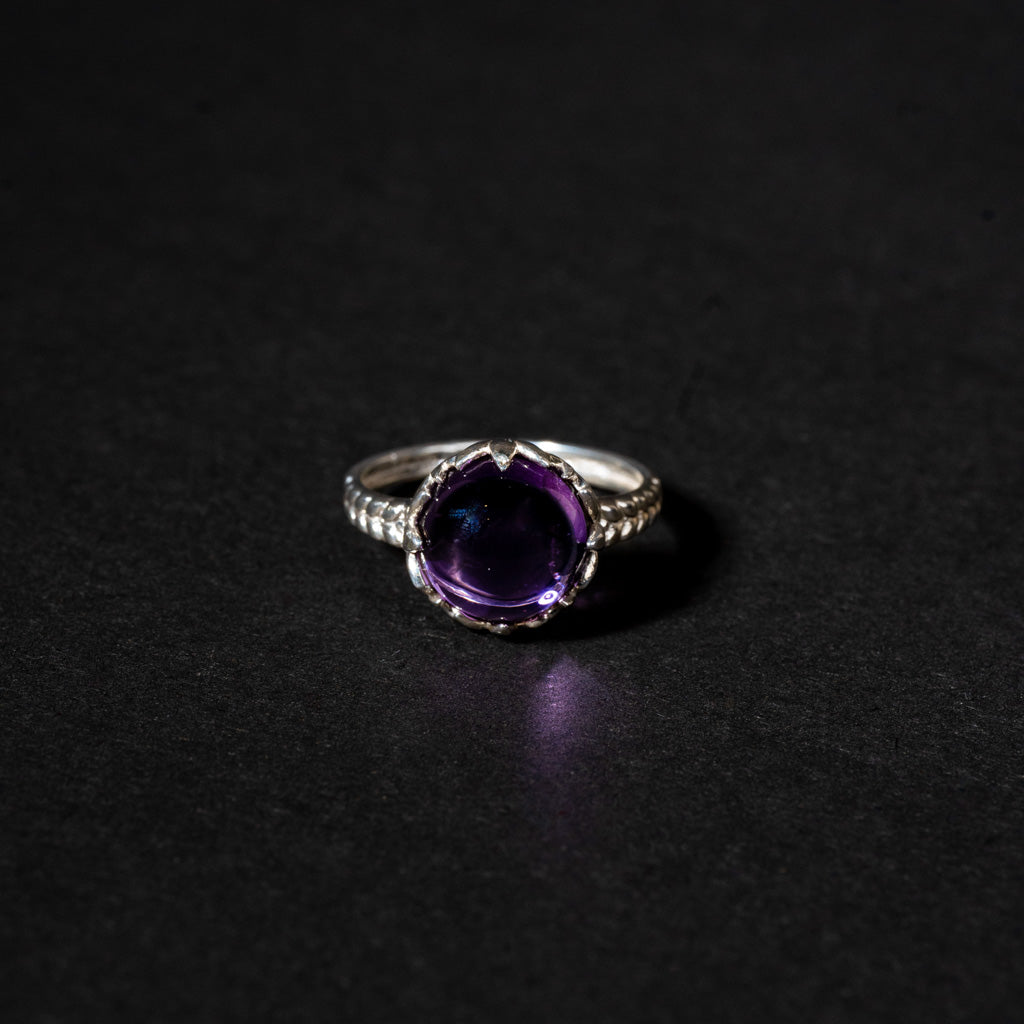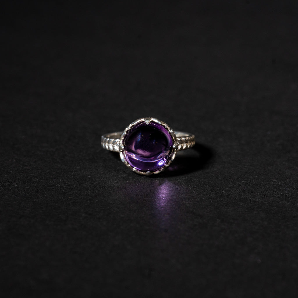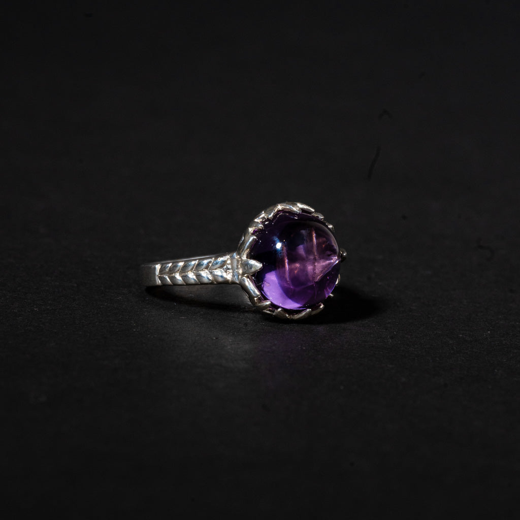 Kehkashaan, a beautiful piece in our new Nageen Collection, is a pure silver ring with an Amethyst Cabochon. The deep purple of Amethyst goes best with silver for sophisticated daily fashion. The purple-silver combination complements solid, monochrome outfits for work and evening gatherings.