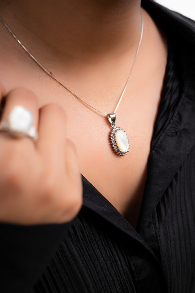 The nacre's subtle sheen shifts from creamy whites to soft greys and pastel hues depending on the light, making it versatile for daily wear or to elevate evening attire. Its neutral tone pairs beautifully with both eastern and western wardrobes.