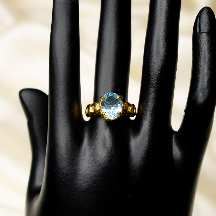 Oval-cut Ice Blue Topaz in pure silver with gold lacquer.