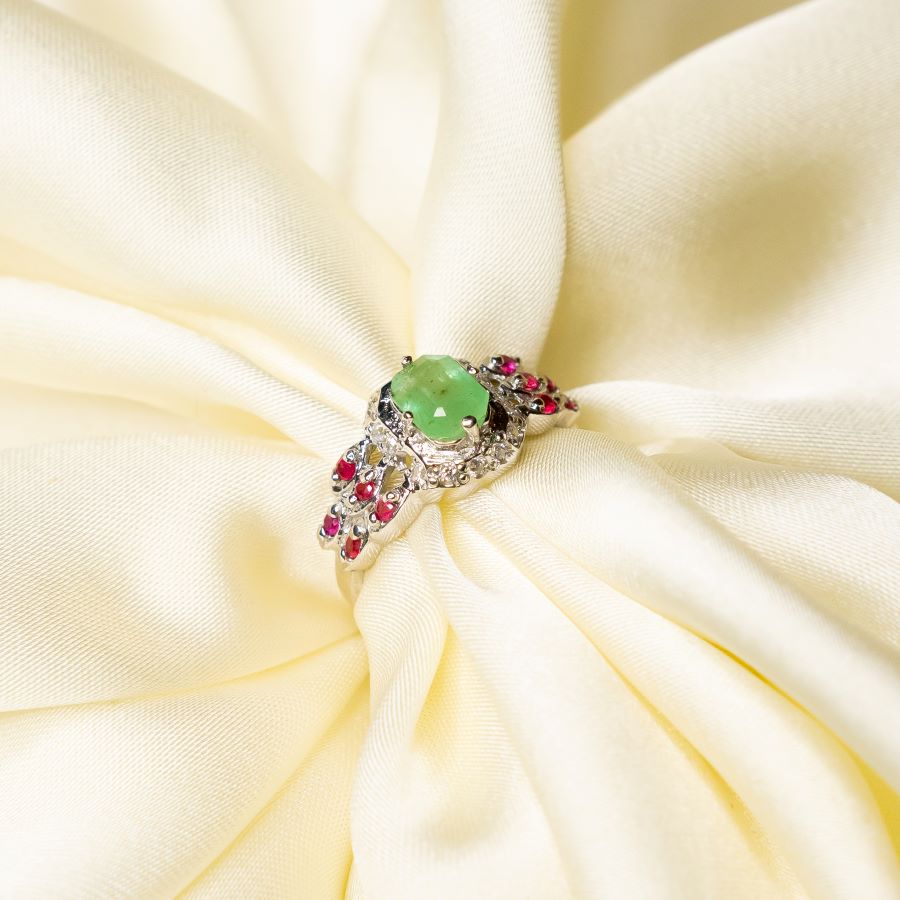 Plucked from the mountains of Baltistan, the emerald is crowned in pure silver with red garnets. This is a piece made exclusively for a queen.