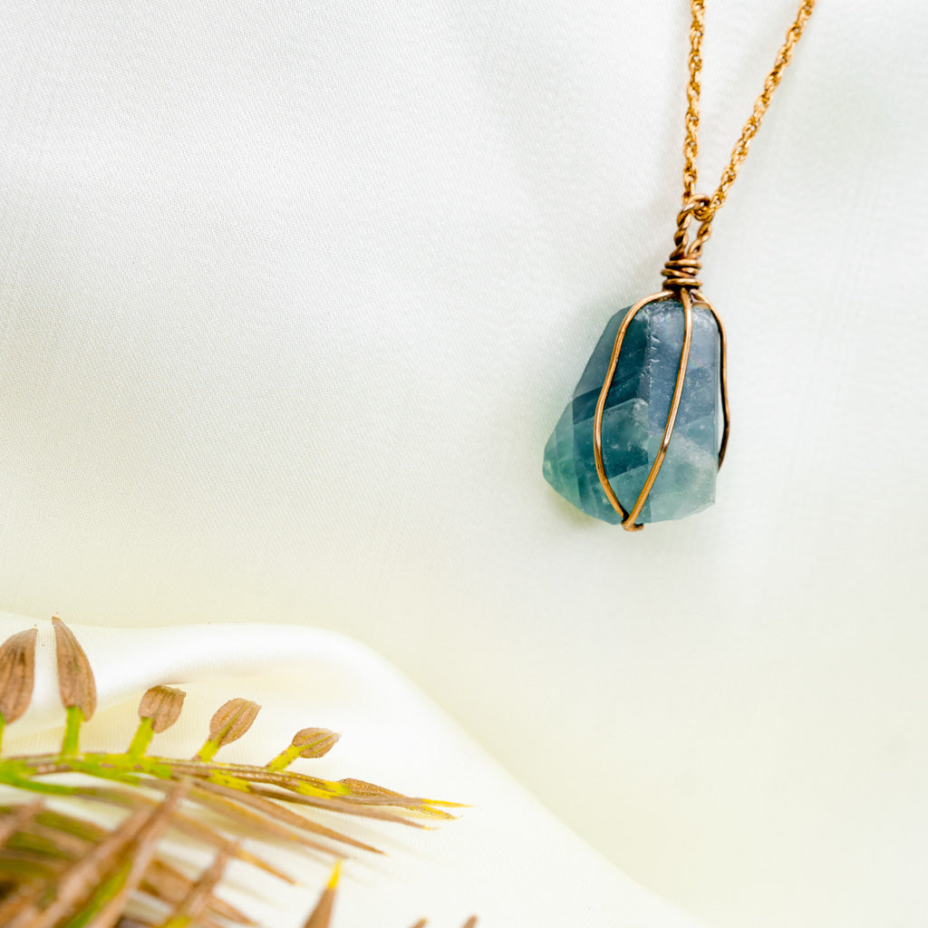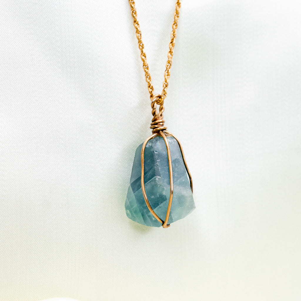 The natural uncut Fluorite is secured in copper wire. This pendant is part of our Raw stone pendant collection, which celebrates the stone's natural energy.