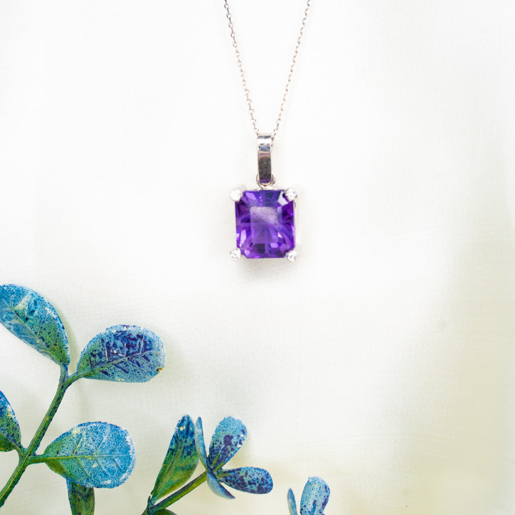 This pendant exudes an air of refined simplicity and timeless elegance. At its center is a captivating, emerald-cut amethyst gemstone, radiating a deep and vibrant violet hue. The amethyst is set in a classic four-prong silver setting, allowing the gem’s natural beauty and precise facets to catch and reflect light with every movement. This pendant is best for party wear with silver, grey, black, and white outfits.