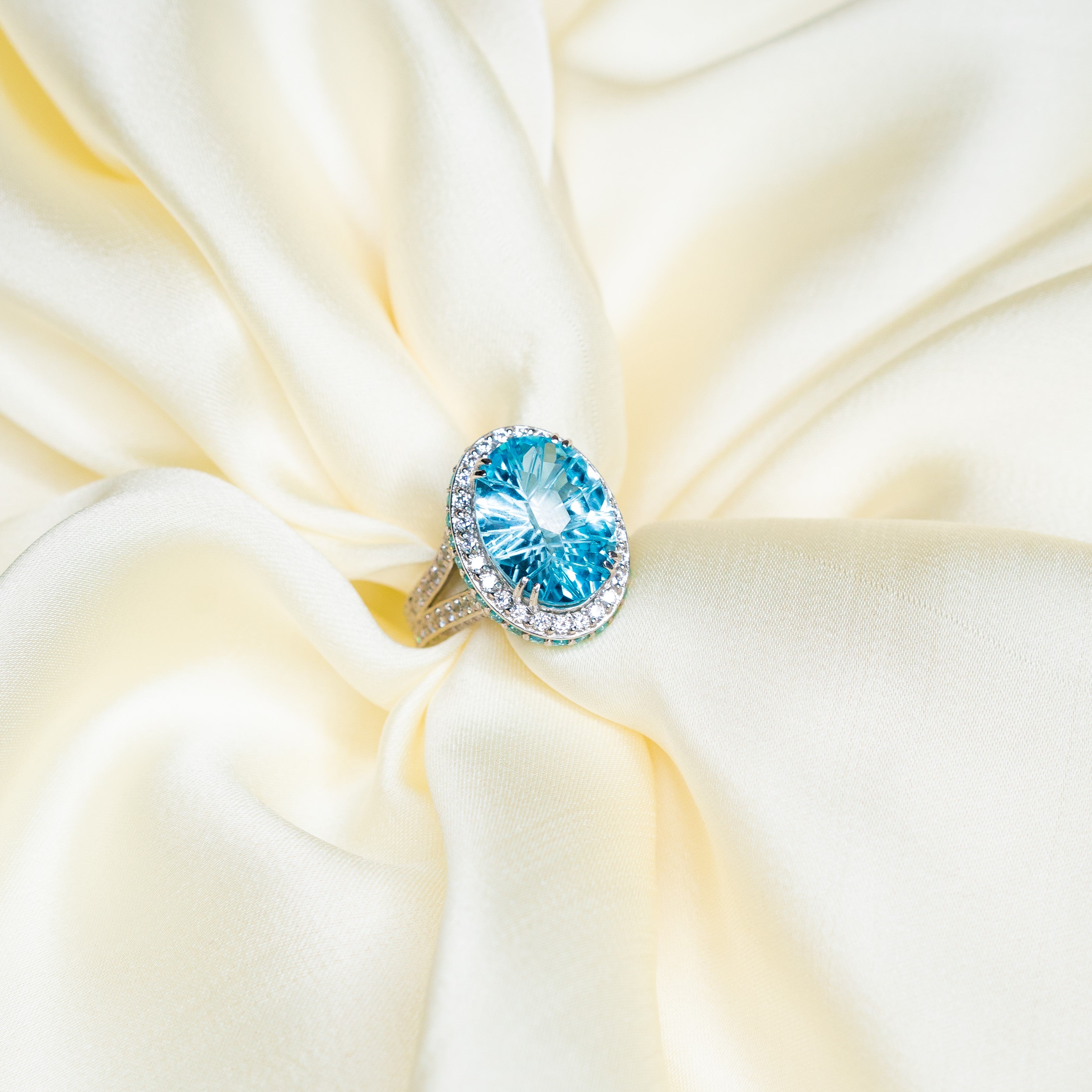 Oval-cut premium, rare Blue Topaz in pure silver. Zircons add the glamour.