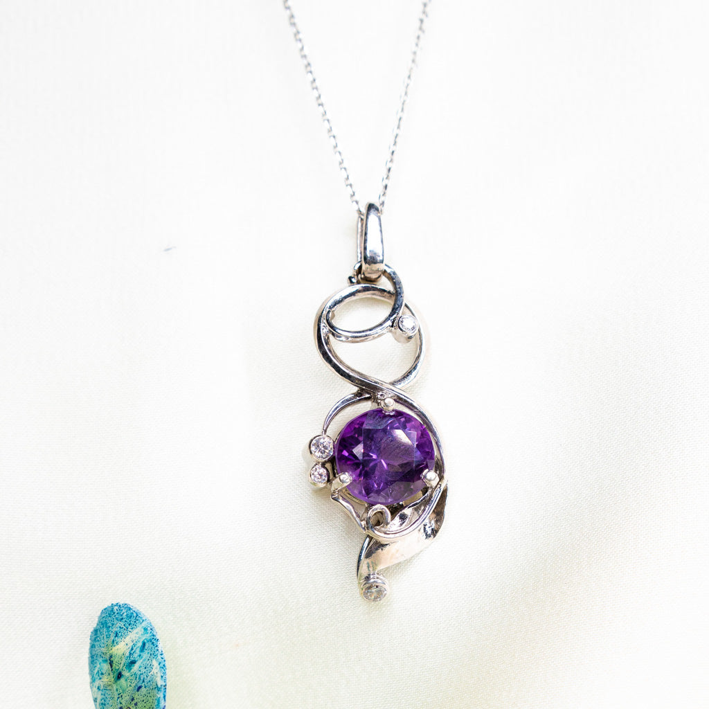 The pendant has a striking combination of silver, a central amethyst gemstone, and zirconia accents. The flowing, infinity-like design with the amethyst as the focal point adds a graceful touch, while the zirconia stones add subtle sparkle and contrast to the deep purple of the amethyst. This makes for an elegant and timeless piece of jewelry.