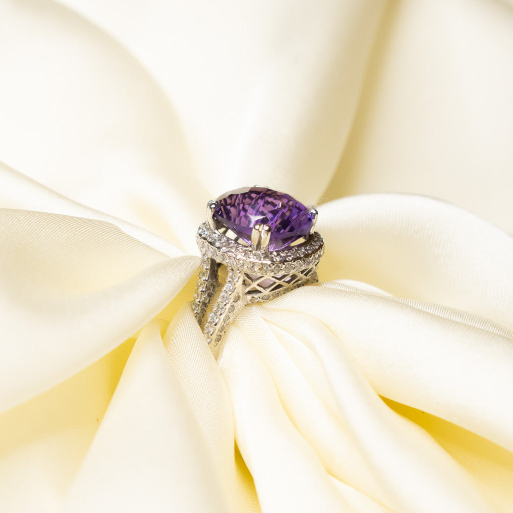 The ring's design is intricate and detailed, with a zircons halo surrounding the amethyst and extending along the band. The combination of silver and purple creates a timeless and versatile piece, perfect for formal occasions and as a statement accessory for everyday elegance.