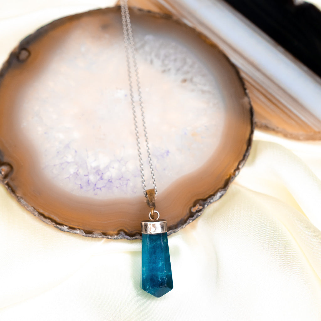 This deep blue Fluorite pendant in silver holder brings balance and peace.